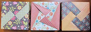 Each of the big square boxes shown on this page was made from eight sheets of scrapbook paper measuring 12 inches square, either selected from open stock or purchased in pads.The lid of each box was assembled from four units and the base of each box was also assembled from four units, with each unit folded from one sheet of paper. |