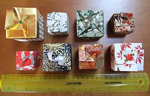 Most of the boxes shown on this page were designed by Tomoko Fuse, with a few designed by Jane Rosemarin. For lidded boxes, each lid required one sheet of paper and each base required one sheet of paper. |